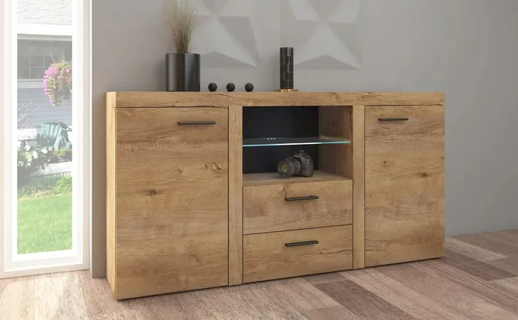 Komoda 2D2S z systemu Rumba wykonana z płyty laminowanej o podwyższonej wytrzymałości w kolorze dąb lefkas uchwyty w kolorze czarnym.