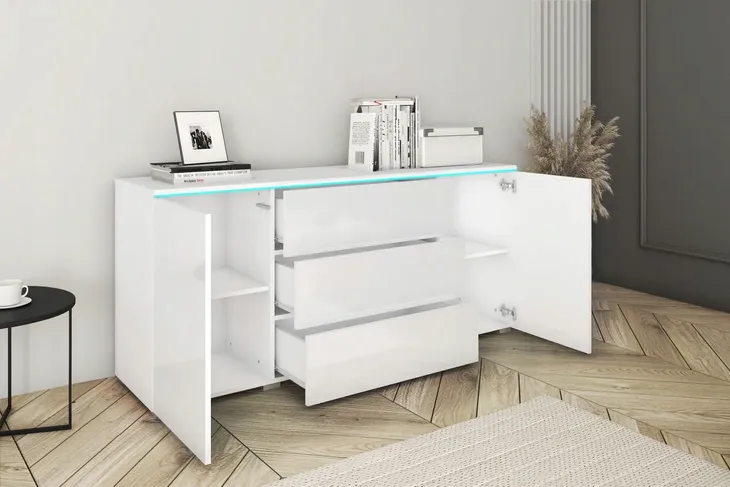 Szklane elementy można podświetlić oświetleniem LED co jeszcze bardziej uatrakcyjni komodę i stworzy idealny klimat w pomieszczeniu.