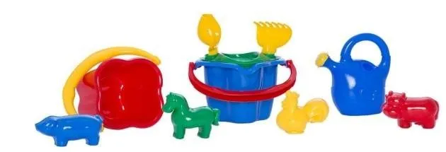 Zestaw zawiera 2 wiaderka "Kogucik" i "Koniczynka", łopatkę, grabki, 4 foremki w kształcie zwierzątek oraz konewkę "Stokrotka" dla Małych Ogrodników. Poszczególne elementy są małe i lekkie. Idealne do podróży