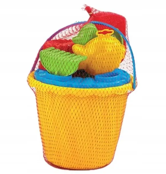 W zestawie: 7 elementów: wiaderko, sitko, grabki, łopatka, 3x foremka.