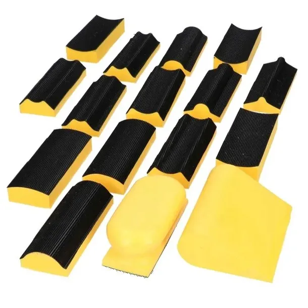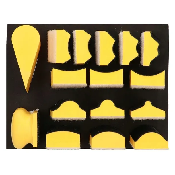 Zestaw 16 klocków szlifierskich na rzep o różnych kształtach i rozmiarach.