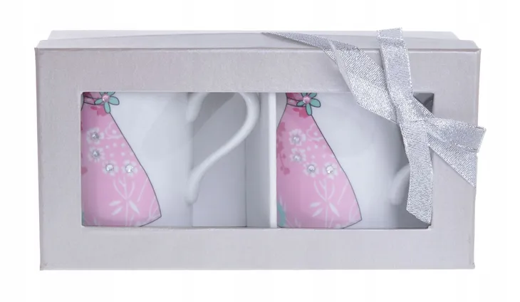 Komplet dwóch dekoracyjnych kubków ozdobionych syntetycznymi kamykami, w prezentowym opakowaniu ze wstążką.