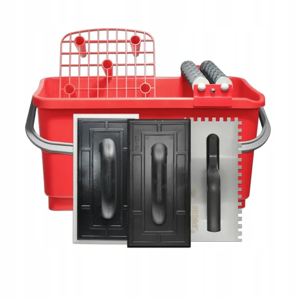 - W komplecie znajduje się wiadro 24 l, rolki, kratka, paca z gąbką gęstą, paca nierdzewna 130 x 270 mm ząb 8 x 8 mm, paca z gumą.