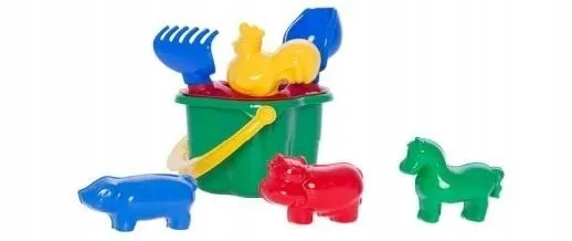 Zestaw zawiera wiaderko "Koniczynka" z sitkiem, łopatkę, grabki oraz 4 foremki w kształcie zwierzątek. Poszczególne elementy są małe i lekkie. Idealne do podróży