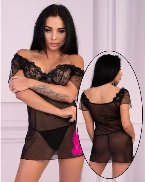 Czerń, ma w sobie to coś. A jeśli jeszcze połączyć ją ze zmysłową bielizną nocną, daje to wyjątkowy efekt. Tu jako zwiewna haleczka nocna z pięknie haftowanymi miseczkami. Zdecydowanie wpada w oko. Rękawki wyglądają uroczo. Tiul elastyczny, prześwitujący, kusi spojrzenie. Twój mężczyzna z pewnością nie będzie mógł oderwać od Ciebie spojrzenia... W komplecie otrzymasz stringi gratis.