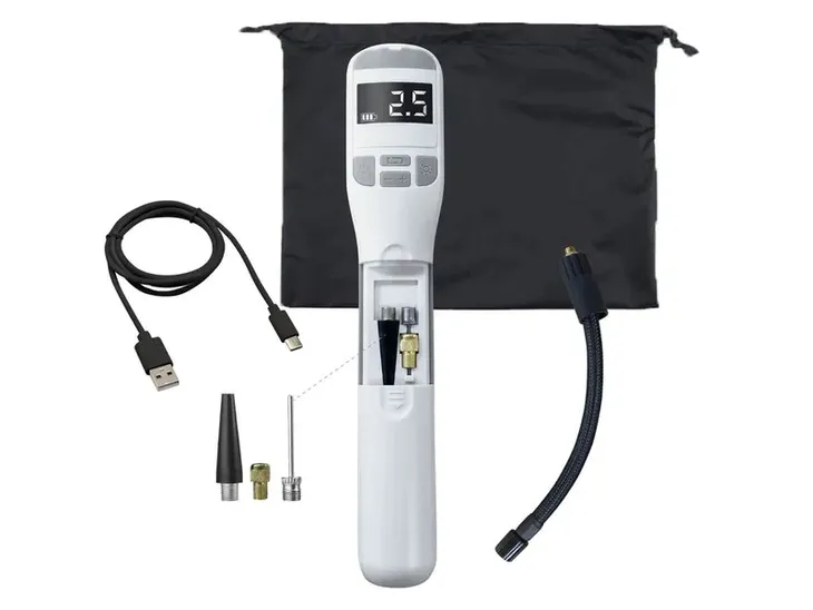 W zestawie znajduje się komplet z dwóch nasadek-adapterów i igły do pompowania piłek, kabel z wtyczką Type-C do ładowania, wąż powietrzny oraz wygodna torba do przechowywania.