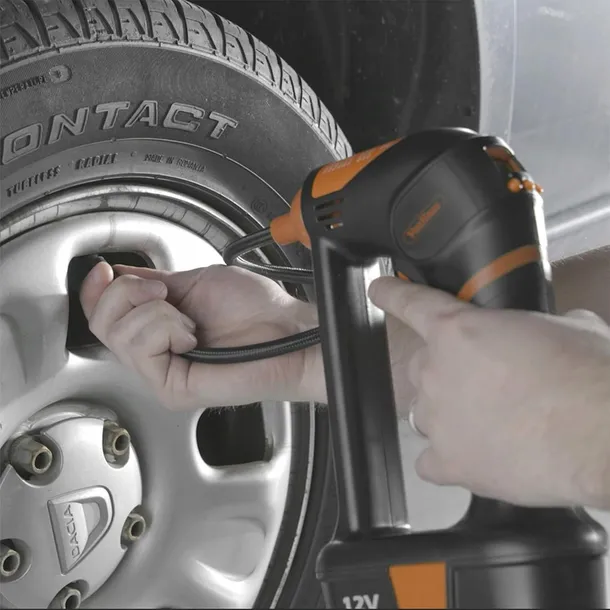 To przenośne urządzenie może napompować opony do samochodów, motocykli i rowerów do maksymalnego ciśnienia 125 psi. Kompresor wyłącza się automatycznie, gdy osiągnie się ustawione ciśnienie.