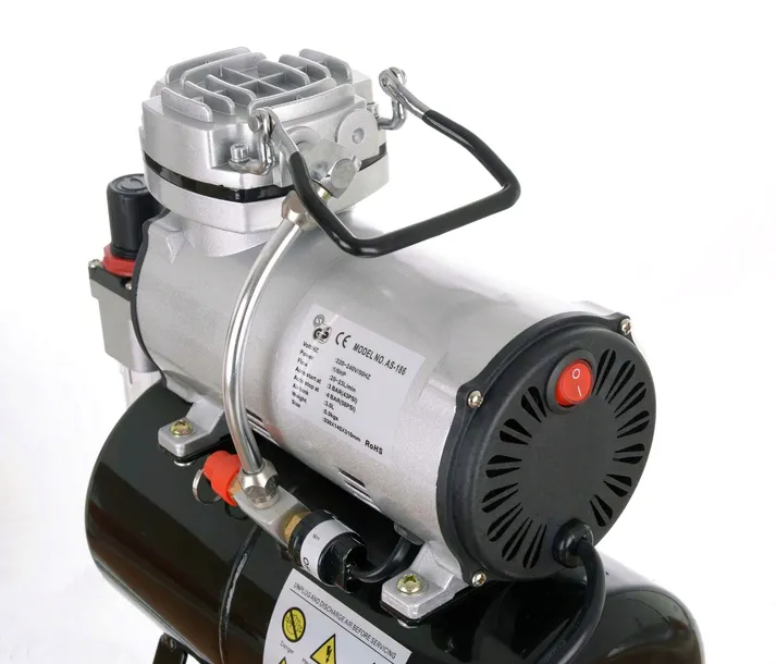 Profesjonalny kompresor tłokowy bezolejowy do każdego typu aerografów, termo-wyłącznikiem i butlą stabilizującą pulsację na wylocie powietrza. Stosowany w salonach kosmetycznych, tatuażu najczęściej w modelarstwie i przy drobnych pracach malarskich.