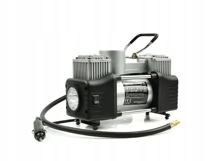 Kompresor samochodowym 250W zasilany napięciem 12-13,5V z gniazda zapalniczki lub bezpośrednio z akumulatora. Wyposażony w czytelny manometr ze stalą w 3 jednostkach: Bar, PSI oraz kg/cm2. Posiada nakręcaną końcówkę przystosowaną do wentyli samochodowych, które stosowane są również w motocyklach oraz rowerach. Wbudowana latarka umożliwia komfortowe korzystanie z kompresora w nocy, bez konieczności posiadania dodatkowego źródła światła. Dodatkowo w zestawie znajduje się pneumatyczny wąż spiralny oraz komplet 3 końcówek do pompowania piłek, materacy itp.