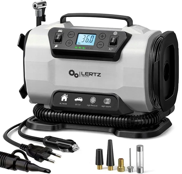 Nowoczesny kompresor samochodowy, rowerowy LERTZ™️z wbudowaną dmuchawą do pompowania materaca to idealne rozwiązanie dla każdego kierowcy. Przydatny w garażu, samochodzie, w domu czy na wyjeździe. Zapewnia wygodę użytkowania oraz zawansowane funkcje pracy - to wszystko w wysokiej jakości wykonaniu.