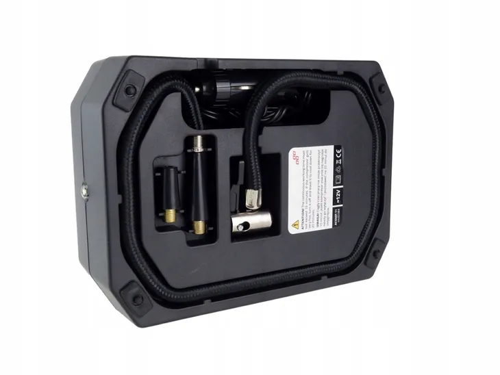 Kompresor samochodowy przeznaczony do pompowania kół samochodowych, rowerowych, piłek a nawet materacy. Podłączenie poprzez gniazdo zapalniczki 12V. W zestawie znajdują się końcówki do pompowania.