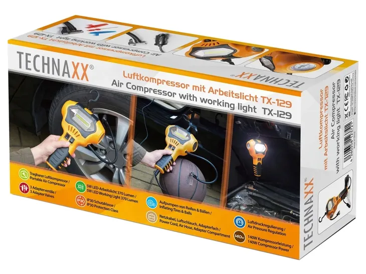 Potrzebujesz rady? Dobrze i praktycznie mieć pod ręką (w samochodzie) przenośny kompresor firmy Technaxx. Jeśli napotkasz problemy z oponami w swoim pojeździe, możesz je szybko samodzielnie napompować! Ale to nie wszystko. Jeśli potrzebujesz światła, TX-129 również służy pomocą, ponieważ jest wyposażony w poręczną lampę roboczą.
