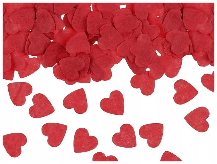 Bibułowe konfetti Serca w kolorze czerwonym wymiary ok. 1,6 x 1,6 cm, opakowanie zawiera ok. 15 g produktu.