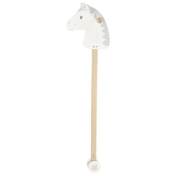 Tradycyjna zabawka, znana nam wszystkim od lat. Konik wykonany jest z lakierowanego drewna w przeważającej białej barwie z szarą grzywą. Do zabawy wystarczy jedynie przykręcić uchwyty po obu stronach grzywy i gotowe.