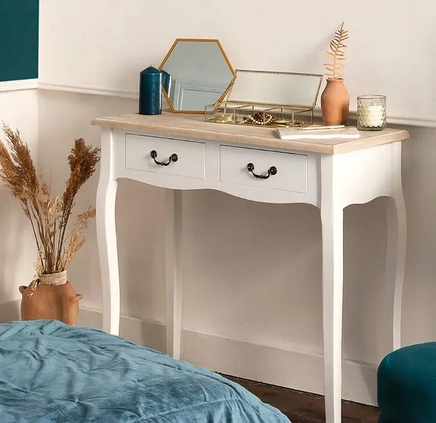 Konsola Chrysa w eleganckiej białej kolorystyce z naturalnym blatem to doskonały wybór dla każdego, kto pragnie dodać swojemu wnętrzu wyjątkowego charakteru. Jej stylowe sosnowe nogi oraz praktyczne dwie szuflady zapewniają nie tylko estetykę, ale i komfort użytkowania w każdym pomieszczeniu, od salonu po przedpokój.
