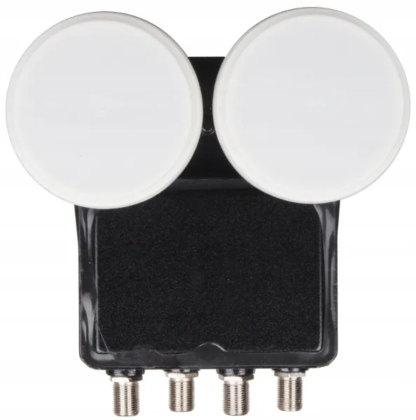 Konwerter Universal Monoblock Quad serii Black Premium marki Inverto z promiennikami na satelity rozstawione o 6 stopni na orbicie (Hot Bird 13E + Astra 19E) z czterema wyjściami bezpośrednio na 4 odbiorniki (dekodery różnych platform) lub dwóch podwójnych odbiorników PVR (oglądanie i nagrywanie niezależnie).
