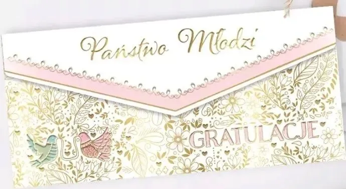 Ozdobna koperta na pieniądze, złocona i tłoczona. W zestawie wkałdka z życzeniami oraz koperta ochronna.