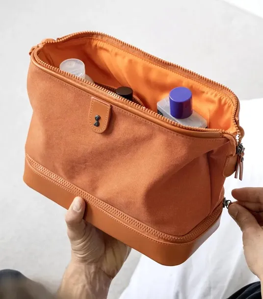 Kosmetyczka od marki Stackers jest wykonana z ekologicznej skóry i materiału tekstylnego w pomarańczowym kolorze.