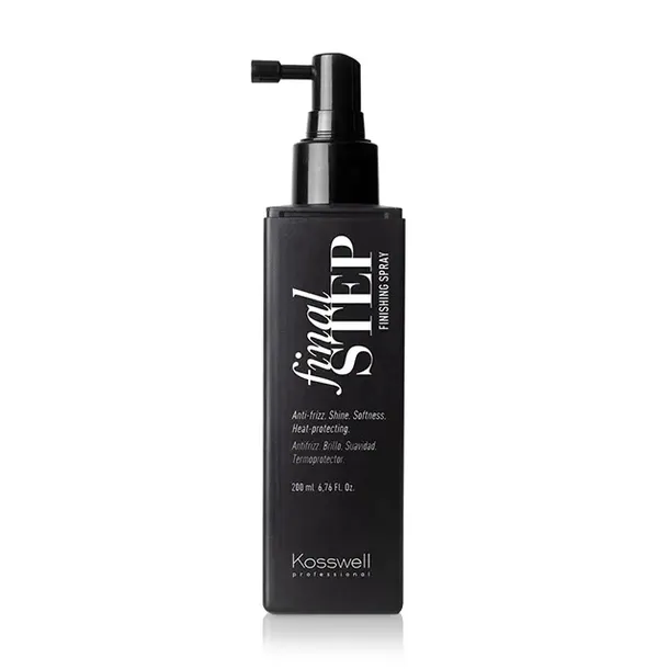 Kosswell Final Step Finishing Spray - spray do stylizacji wszystkich rodzajów włosów, który daje efekt laminacji włosów. Poprawia strukturę włosów, zapewniając im miękkość i niesamowity połysk. Dodatkowo pomaga podczas codziennej stylizacji włosów trudnych i puszących się. Zapewnia termoochronę włosów podczas stosowania suszarki, prostownicy czy lokówki. Kosswell Final Step Finishing Spray dzięki swojemu innowacyjnemu składowi tworzy warstwę ochronną, pozostawiając włosy niezwykle lśniące i gładkie, zapewniając im efekt laminacji.