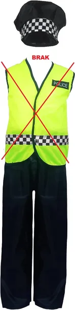 Kolor czarny, biały.Wiek 4-6lat.Materiał poliester.W zestawie spodnie oraz kapelusz.Stan niekompletny, nowy - brak żółtej kamizelki.