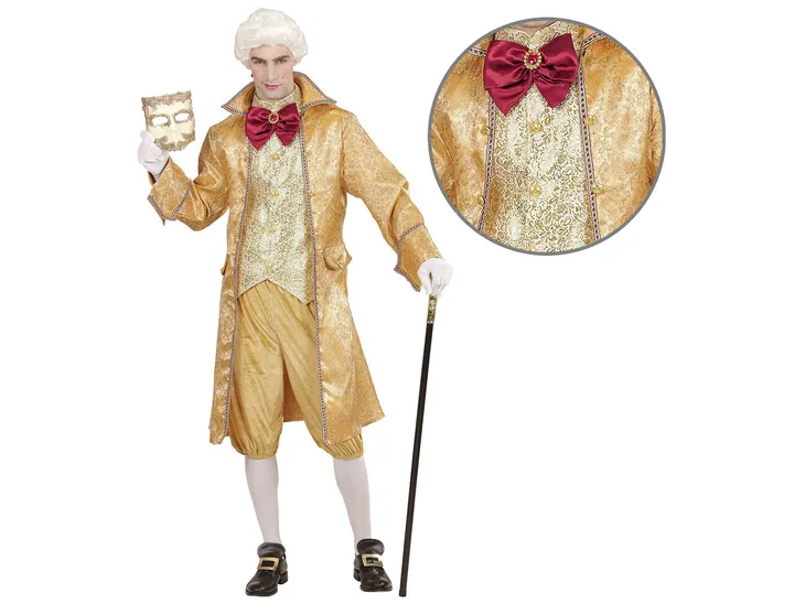 Kostium weneckiego szlachcica dla mężczyzny.W komplecie: płaszcz z kamizelką i muchą, spodnie.Rozmiar: S.Wykonany z poliestru.