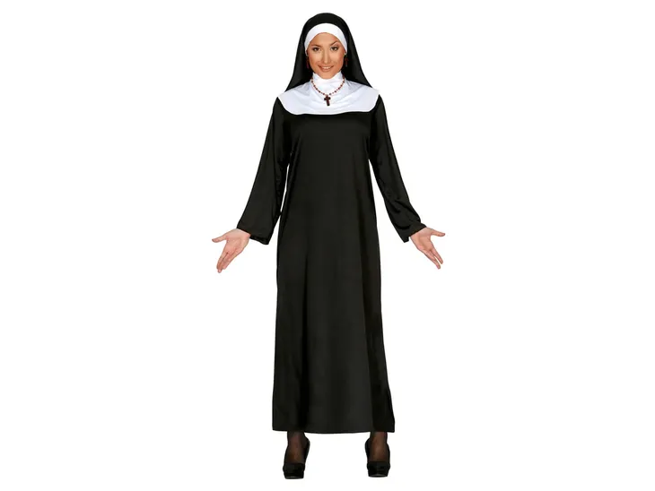 Strój zakonnicy dla kobiety.W komplecie: sukienka, welon.Rozmiar: M 38/40.Wymiary:Szerokość w klatce piersiowej: 56 cmSzerokość w pasie: 56 cm - 62 cmSzerokość w biodrach: 61 cm - 69 cmDługość całkowita: 131 cm