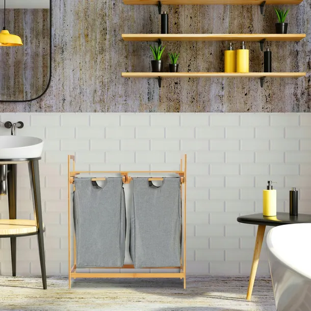 Podwójny bambusowy kosz na bieliznę z półką RD2155, szaryZrelaksuj sięDPodwójny bambusowy kosz na bieliznę z półką RD2155, szaryZbierz brudne pranie w dobrym stylu dzięki temu koszowi na pranie. Nowoczesny design rustykalnego kosza z solidną bambusową ramą i szarymi workami na pranie świetnie prezentuje się w Twojej łazience lub sypialni. Na górnej półce umieść przedmioty dekoracyjne, ręczniki lub kosmetyki. W 2 wysuwanych przegródkach po obu stronach można przechowywać do 60 litrów prania. Worek na pranie można łatwo przenieść do pralki za pomocą bocznych uchwytów.Charakterystyka: Do prania: Bambusowy kosz na brudną bieliznę - 2 oddzielne przegródki do sortowania Praktyczne: na półce możesz umieścić przedmioty dekoracyjne, kosmetyki i nie tylko Chowany: Kieszenie wewnętrzne - każda o pojemności około 30 l, można łatwo wsuwać i wyjmować Dekoracyjne: nowoczesne kosze na bieliznę w stylu rustykalnym do sypialni lub łazienki - uchwyty do przenoszenia Basics: przegródka na pranie z solidną ramą - torby z tkaniny wykonane z poliestru - HBT: ok. 73 x 63,5 x 33 cmZawartość: 1x bambusowy kosz na bieliznę z półką - zdemontowany Materiał montażowyParametry: Wymiary wys. x szer. x gł.: ok. 73 x 64 x 33 cm Pojemność jednego worka na pranie: ok. 30 l Półka szer. x głęb.: ok. 61 x 33 cm Waga: ok. 4,2 kg Materiał: bambus, mieszanka poliestru i bawełny Kolor: naturalny, szary