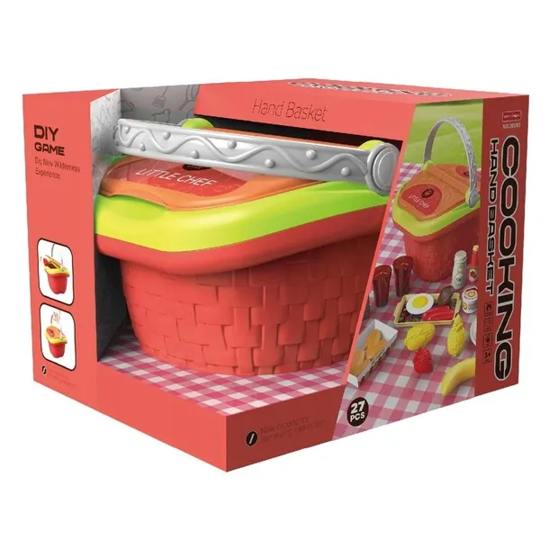 Koszyk piknikowy z akcesoriami. W zestawie kosz, plastikowe owoce, warzywa, mięso, buteleczki z przyprawami, grill, garnek, naklejki. Łącznie 27 elementów.