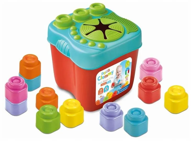 Nowe wiaderko Clemmy z miękką pokrywką, wyposażoną w zróżnicowane formy, struktury i połączenia zachęcające do zabawy 15 klockami dołączonymi do ękkie i kolorowe klocki pomagają dziecku rozwijać zręczność oraz percepcję dotykową i wzrokową. Zabawka jest wykończona nową pokrywką, klocki można ustawiać na połączeniach lub wkładać do wiaderka przez otwór w kształcie kwiatka. Clemmy doskonale wspomaga rozwój multisensoryczny ść i bezpieczeństwo świata Clemmy. Wyprodukowane we Włoszech.