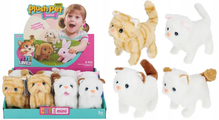 Zalety produktu: efekty ruchowe i dźwiękowe, miękki plusz, nauka dbania o pupila, występuje w 3 kolorach: białym, szarym oraz beżowym. Kotek jest świetną propozycją dla wszystkich maluchów uwielbiających zwierzaki Kotek posiada efekty dźwiękowe oraz ruchowe: miauczy, chodzi oraz rusza główką i macha ogonkiem, no jak go tu nie polubić? Zabawka wykonana z plastiku oraz pluszu. Zawartość zestawu: Kotek interaktywny. Wymiary/waga/baterie: wymiary produktu: dł. x wys. x gł. cm : 20x15x10, wymiary opakowania-display dł. x wys. x gł. cm : 26x14x29, waga produktu bez opakowania kg : 0,14 kg, waga produktu w opakowaniu display kg : 1,01kg, wymaga zasilania bateriami 2 x AALR06-nie załączonymi do zestawu. Przeznaczona dla dzieci w wieku: 3 . Zestaw pakowany w display po 6 szt. W kartonie zbiorczym po 72 szt.