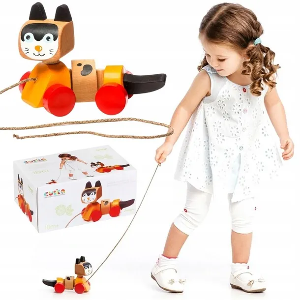 Drewniana zabawka Walk-A-Long Cat przeznaczona jest dla dzieci od 18 miesiąca życia. Zabawka składa się z kilku sekcji połączonych sznurkiem. Podczas ruchu zabawka zabawnie się porusza i przypomina ruch kociego ogona. Dziecko może go przekręcić, poprawiając w ten sposób swoje umiejętności motoryczne. Przed zabawką znajduje się lina. To świetna opcja zarówno do zabaw domowych, jak i zabaw na świeżym powietrzu.