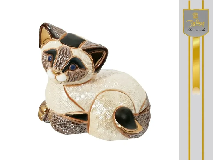 Bajeczna figurka przedstawiająca małego kotka syjamskiego z pięknymi zdobieniami. Niezwykłość zbioru polega na tym, że zakup 4 figurek z serii pozwoli Wam stworzyć uroczą kocią rodzinkę. Ręczne wykonanie figurki nadaje jej niepowtarzalnego charakteru. Doskonałą jakość podkreślają subtelne złocenia. Niezwykłe dzieło sztuki na pewno zachwyci poszukiwaczy unikatów. Świetny prezent.