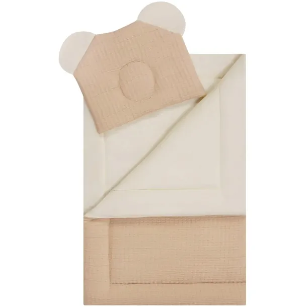 Wykonany z najwyższej jakości artykułów tekstylnych dla dzieci. Komplet ten świetnie sprawdza się w wózkach, kołyskach czy łóżeczkach. Tkanina wafel, nowoczesny design kocyka oraz poduszka miś to świetny wybór dla malucha.