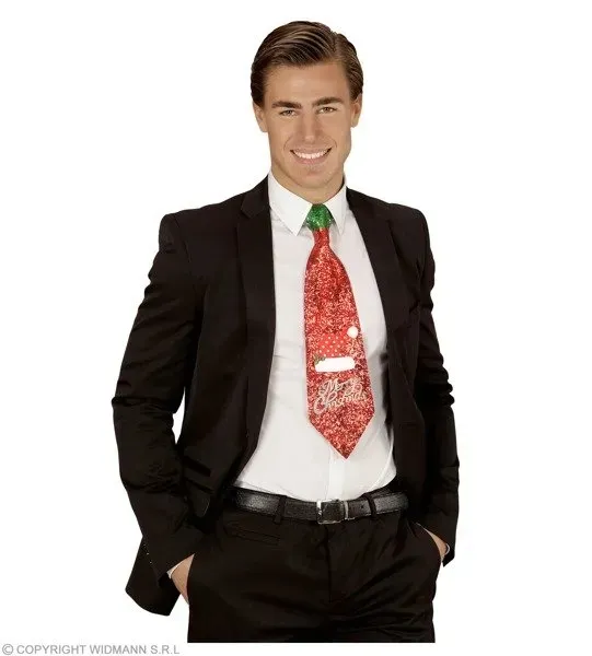 Krawat zakładany za pomocą gumki na szyję. W całości z przodu pokryty brokatem, zdobiony złotym napisem Merry Christmas. Tył krawata czerwony filcowy.