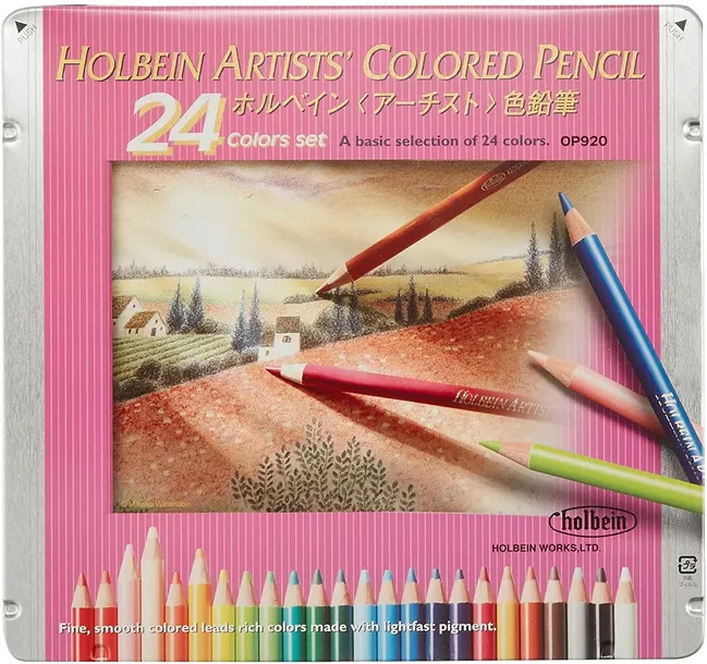 Profesjonalne kredki artystyczne japońskiej marki Holbein. Zestaw zawiera 24 kredek w podstawowych kolorach umieszczonych w metalowym opakowaniu.· OP 500 white· OP 510 black· OP 533 cool grey 3· OP 180 burnt umber· OP 057 burnt sienna· OP 153 yellow ochre· OP 449 magenta· OP 441 violet· OP 368 prussian blue· OP 347 cobalt blue· OP 335 cerulean blue· OP 323 aqua· OP 267 forest green· OP 264 holly green· OP 247 viridian· OP 243 fresh green· OP 251 apple green· OP 147 canary yellow· OP 142 marigold· OP 048 orange· OP 122 jaune brillant· OP 022 pink· OP 044 scarlet· OP 042 carmine