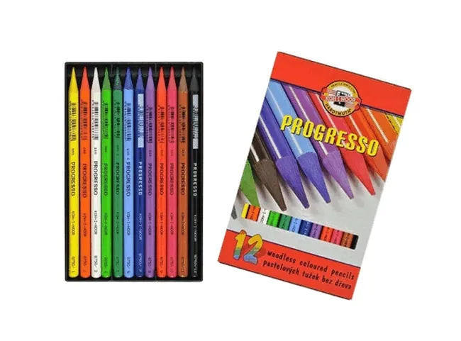Specjalne, bezdrzewne kredki Progresso pokryte bezbarwnym lakierem wykonana w całości z kolorowego sztyftu długość kredki: 153 mm zestaw: 12 kolorów (zestawienie kolorów poniżej) wyszczególnienie barw (nr koloru): 03, .01, 0,9, 02, 10, 09, 08, 06, 07, 04, 05, 11, 12