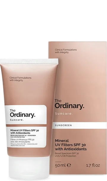 The Ordinary - Mineralne Filtry UV SPF30 z Antyoksydantami - filtr przeciwsłoneczny, który chroni Twoją skórę przed szkodliwym promieniowaniem słonecznym. Substancje chroniące przed promieniowaniem zawarte w kremie to Tlenek Cynku (tlenek cynku) i Tytanu Dwutlenek (tlenek tytanu IV), które są filtrami fizycznymi (mineralnymi) dobrze tolerowanymi przez wrażliwe skóry. Produkt wzbogacony jest również o składniki nawilżające i łagodzące, chroniące skórę przed stresem oksydacyjnym. Kosmetyki mają pH w zakresie 7,0 i 8,5. Nie zawiera alkoholu i jest wegański.