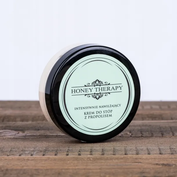 Krem do stóp z dodatkiem propolisu o świeżym zapachu zielonej herbaty intensywnie nawilża suchą skórę stóp, łagodzi podrażnienia, redukuje zrogowacenie na piętach oraz zmiękcza naskórek.