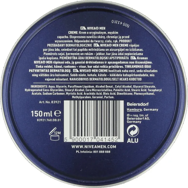 NIVEA Men Creme to nowy produkt, który został stworzony specjalnie z myślą o mężczyznach. Jego formuła wzbogacona o witaminę E przywraca nawilżenie skóry w zaledwie kilka sekund, a jego ultra szybko wchłaniająca się formuła zapobiega wysuszaniu skóry, nie pozostawiając tłustej warstwy. Krem ma świeży, męski zapach i jest doskonały do aplikowania zarówno na skórę twarzy, rąk, jak i poszczególnych partii ciała, np. łokci – tzn. idealnie sprawdzi się wszędzie tam, gdzie skóra może się przesuszać. Aby zachować zdrowy i zadbany wygląd skóry, regularnie stosuj kosmetyki przeznaczone do pielęgnacji skóry mężczyzn z szerokiej gamy produktów NIVEA Men.