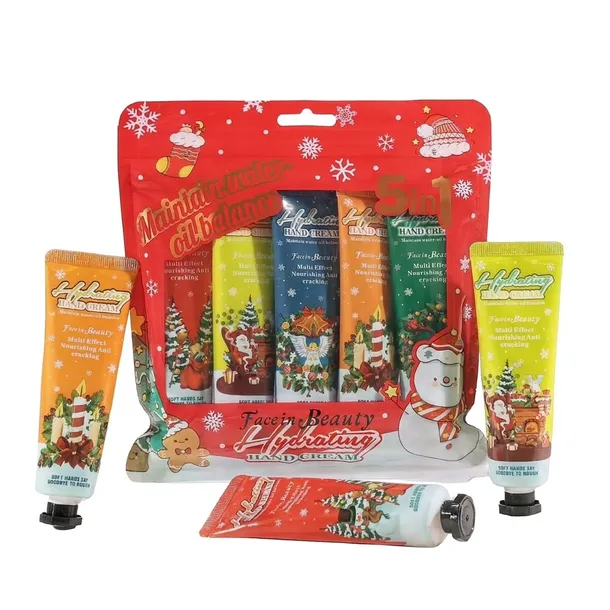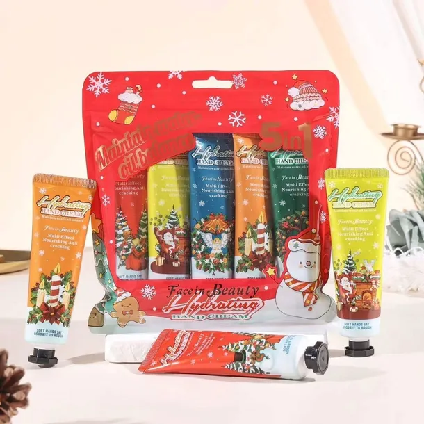 Zestaw zawiera pięć tubek kremu do rąk o pojemności 30 ml każda, zapakowanych w świąteczne opakowanie prezentowe.
