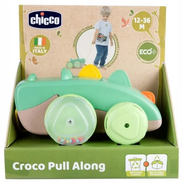 Rozkołysany Krokodyl - Zabawka do Ciągnięcia od ChiccoGrupa wiekowa: 12-36MRozkołysany Krokodyl to urocza zabawka do ciągnięcia, która zachęci Twoje dziecko do chodzenia i rozwijania umiejętności psychomotorycznych. Ta innowacyjna zabawka dostarcza mnóstwo zabawy, wspierając jednocześnie rozwój fizyczny i sensoryczny maluszka. CIEKAWE FUNKCJEZabawne poruszanie: Poprzez pociągnięcie sznurka, Krokodyl będzie w zabawny sposób poruszał w górę i w dół tarcze grzbietowe, co z pewnością przyciągnie uwagę dziecka.Dźwięki grzechotania: Pociągnij sznurek, aby usłyszeć dźwięki grzechotania i zobaczyć kolorowe koraliki poruszające się wewnątrz kół, co dodatkowo stymuluje zmysły dziecka. WSPIERANIE ROZWOJURozwój psychomotoryczny: Zabawa z Krokodylem wspiera rozwój umiejętności psychomotorycznych, zachęcając dziecko do chodzenia i koordynacji ruchowej.Długość sznurka: Sznurek ma długość 50 cm, co umożliwia dziecku wygodne chodzenie i prowadzenie Krokodyla. ZRÓWNOWAŻONA KOLEKCJA ZABAWEKPlastik z recyklingu: Wszystkie zabawki ECO+ od Chicco wykonane są z plastiku pochodzącego z recyklingu lub bioplastiku oraz są bezpieczne i trwałe. Rozkołysany Krokodyl wykonany jest w 55% z plastiku pochodzącego z recyklingu odpadów przemysłowych, co przyczynia się do ochrony ś opakowanie: ECO+ opiera się na produkcji z wielką dbałością o środowisko, zarówno przy opracowywaniu produktów, jak i opakowań, które nadają się do recyklingu i są wykonane z papieru pochodzącego z odpowiedzialnie zarządzanego lasu (certyfikat FSC(R)). PRODUKCJA WE WŁOSZECHKolekcja ECO+ została zaprojektowana i wyprodukowana we Włoszech, z najwyższą dbałością o jakość i bezpieczeństwo produktów, zawsze z poszanowaniem środowiska. SPECYFIKACJA PRODUKTUGrupa wiekowa: 12-36 miesięcyWymiary zabawki: 20 x 10,5 x 12 cmWymiary opakowania: 23 x 23 x 14,5 cm Rozkołysany Krokodyl to idealna zabawka dla Twojego maluszka, która zachęci go do aktywności fizycznej i rozwijania umiejętności motorycznych. Dzięki interaktywnym funkcjom i ekologicznemu wykonaniu, Krokodyl stanie się ulubionym towarzyszem spacerów i zabawy w domu. Kup teraz i podaruj swojemu dziecku godziny radosnej zabawy z Rozkołysanym Krokodylem!