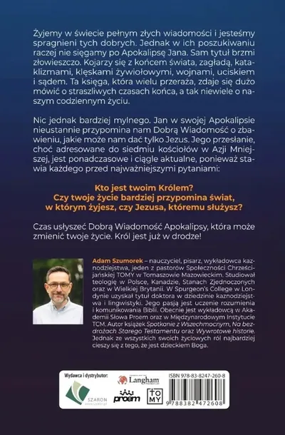 Żyjemy w świecie pełnym złych wiadomości i jesteśmy spragnieni tych dobrych. Jednak w ich poszukiwaniu raczej nie sięgamy po Apokalipsę Jana. Sam tytuł brzmi złowieszczo. Kojarzy się z końcem świata, zagładą, kataklizmami, klęskami żywiołowymi, wojnami, uciskiem i sądem. Ta księga, która wielu przeraża, zdaje się dużo mówić o straszliwych czasach końca, a tak niewiele o naszym codziennym życiu. Nic jednak bardziej mylnego. Jan w swojej Apokalipsie nieustannie przypomina nam Dobrą Wiadomość o zbawieniu, jakie może nam dać tylko Jezus. Jego przesłanie, choć adresowane do siedmiu kościołów w Azji Mniejszej, jest ponadczasowe i ciągle aktualne, ponieważ stawia każdego przed najważniejszymi pytaniami: Kto jest twoim Królem? Czy twoje życie bardziej przypomina świat, w którym żyjesz, czy Jezusa, któremu służysz? Czas usłyszeć Dobrą Wiadomość Apokalipsy, która może zmienić twoje życie. Król jest już w drodze!