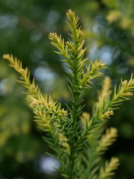 Igły: młode przyrosty są kremowo żółte późną wiosną pędy lekko zielenieją, aż w końcu stają się coraz bardziej żółte, aż do miedzianożółtych w okresie zimowym