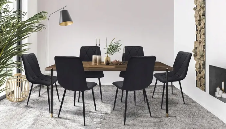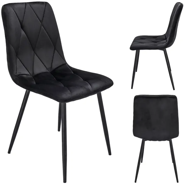 Krzesło tapicerowane jest welurem, a po wewnętrznej stronie pikowane regularnymi przeszyciami w romby. Wysokie i smukłe nóżki w czarnym kolorze wyglądają bardzo szykownie oraz gwarantują idealną stabilność.