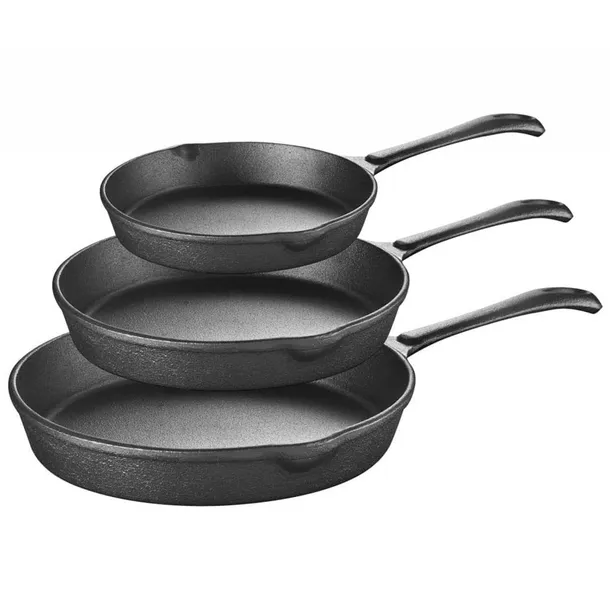 Zestaw 3 patelni 16 / 20 / 25cm. Żeliwo z którego jest wykonane naczynie jest grube i ciężkie aby odpowiednio skumulować i utrzymać wysoką temperaturę.