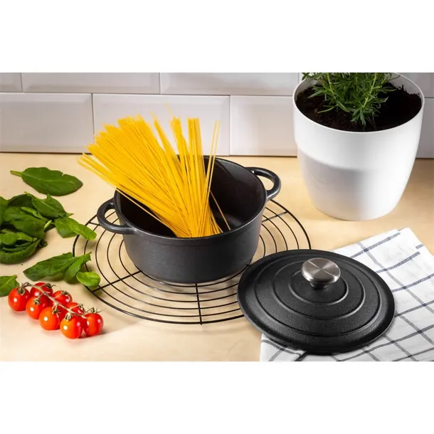 Garnek 5.5L wykonany z odlewu żeliwa. Bardzo ciężki. Bez żadnych powłok konserwujących, czyste żeliwo. Pozbawione kantów profilowane dno ułatwiają nakładanie potraw jak i utrzymanie garnka w czystości. Jest odporny na ścieranie i wysokie temperatury. Głęboki, idealny do smażenia i pieczenia. Pokrywa żeliwna z uchwytem ze stali nierdzewnej.