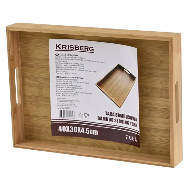Taca została wykonana z naturalnego drewna bambusowego w połączeniu z MDF, dzięki czemu jest trwała, odporna na wilgoć i łatwa w utrzymaniu czystości. Jej klasyczny, prostokątny kształt oraz minimalistyczny design sprawiają, że doskonale nadaje się zarówno do codziennego użytku, jak i do serwowania przekąsek na przyjęciach.