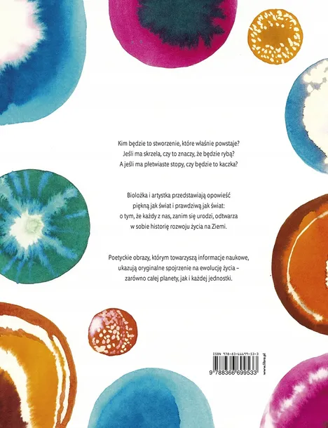 Kim będzie to stworzenie, które właśnie powstaje? Jeśli ma skrzela, czy to znaczy, że będzie rybą? A jeśli ma płetwiaste stopy, czy będzie to kaczka? Biolożka i artystka przedstawiają opowieść piękną jak świat i prawdziwą jak świat: o tym, że każdy z nas, zanim się urodzi, odtwarza w sobie historię rozwoju życia na Ziemi. Poetyckie obrazy, którym towarzyszą informacje naukowe, ukazują oryginalne spojrzenie na ewolucję życia – zarówno całej planety, jak i każdej jednostki.