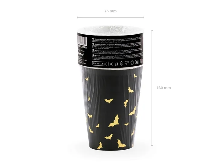 Kubeczki papierowe Trick or Treat w kolorze czarnym ze złotym wzorem, pojemność ok. 220 ml. Kubki na napoje zawierają oznaczenia wymagane przez Rozporządzenie wykonawcze Komisji (UE) 2020/2151 z dnia 17 grudnia 2020 r. ustanawiające zasady dotyczące zharmonizowanych specyfikacji w odniesieniu do oznakowania produktów jednorazowego użytku z tworzyw sztucznych wymienionych w części D załącznika do dyrektywy Parlamentu Europejskiego i Rady (UE) 2019/904 w sprawie zmniejszenia wpływu niektórych produktów z tworzyw sztucznych na środowisko. Produkt zawiera etykietę wyłącznie w języku polskim, niemieckim, czeskim, francuskim, niderlandzkim, słowackim, słoweńskim i bułgarskim.