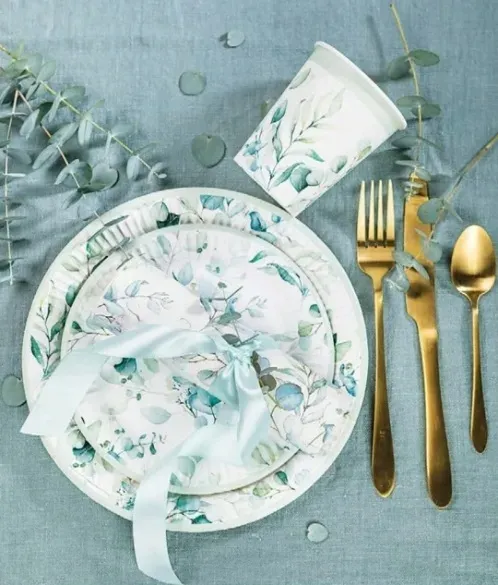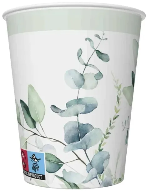 Kubeczki papierowe w kolorze białym z zielonymi liśćmi eukaliptusa - 8 sztuk